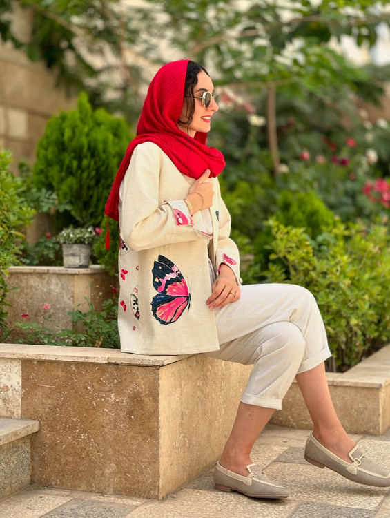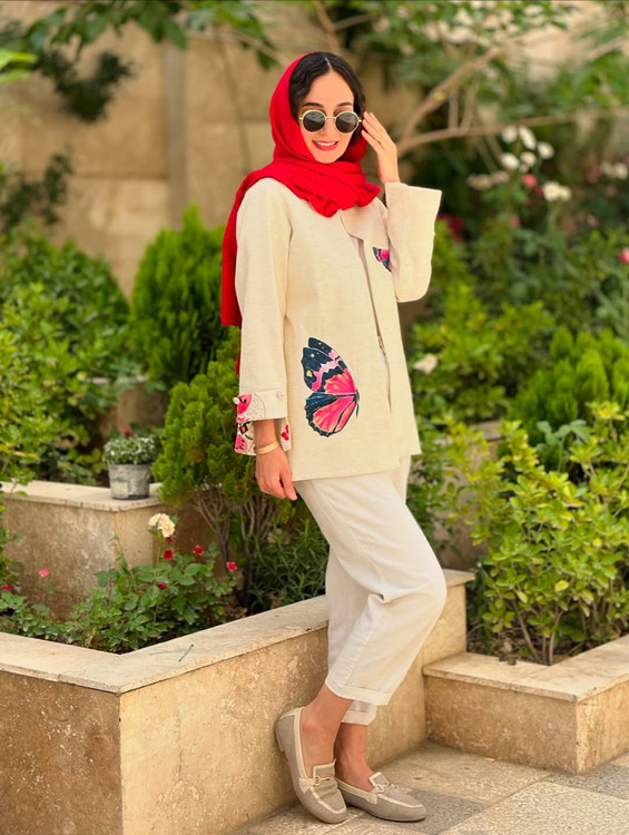تابستونی ترین کتمون اسلاید حتما ببین پشتش سوزندوزیه و جلوی کار نقاشی شدست جنسش لینن لایه کوبیه با جواهر دوزی هم قابل سفارشه تمام مشخصاتش رو از ریلزش میتونید ببینید ثبت از سایت و Www.masoumeshakouri.ir